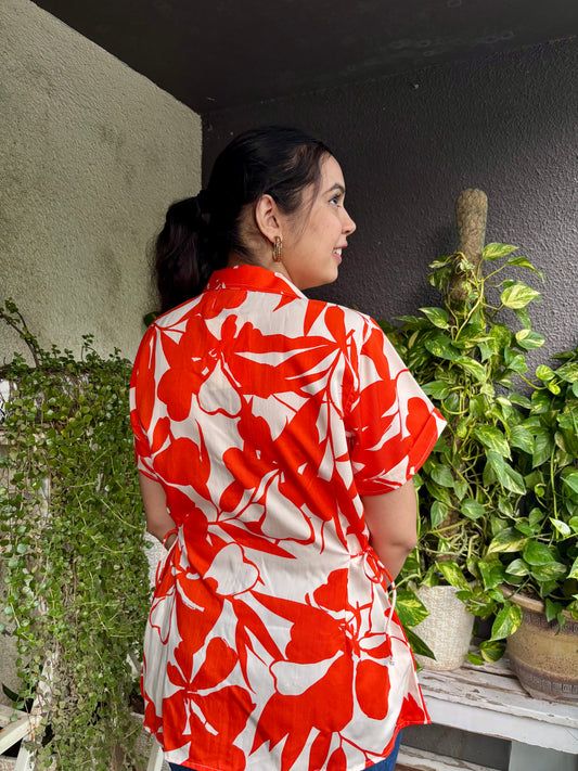 Orange Floral Print Cotton Shirt