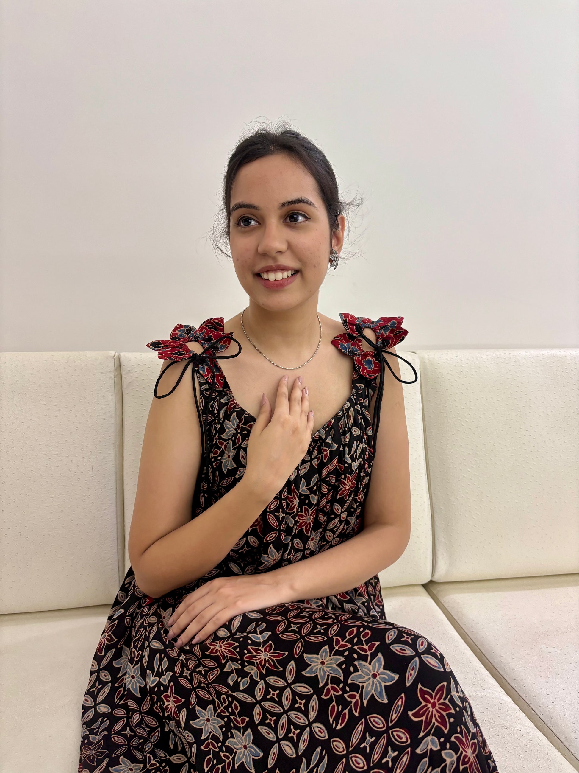 Elevate your wardrobe with the Midnight Soirée Ajrakh Dress, crafted from luxurious modal satin. This stunning piece features authentic Ajrakh block printing in mesmerizing black and pink tones, complemented by delicate floral detailing on the shoulders. The soft, lustrous fabric drapes beautifully, while the A-line silhouette flatters every figure. Perfect for weddings, festive celebrations, or sophisticated evening gatherings. A timeless classic that blends traditional artistry with contemporary elegance – this is the dress you'll reach for every special occasion.