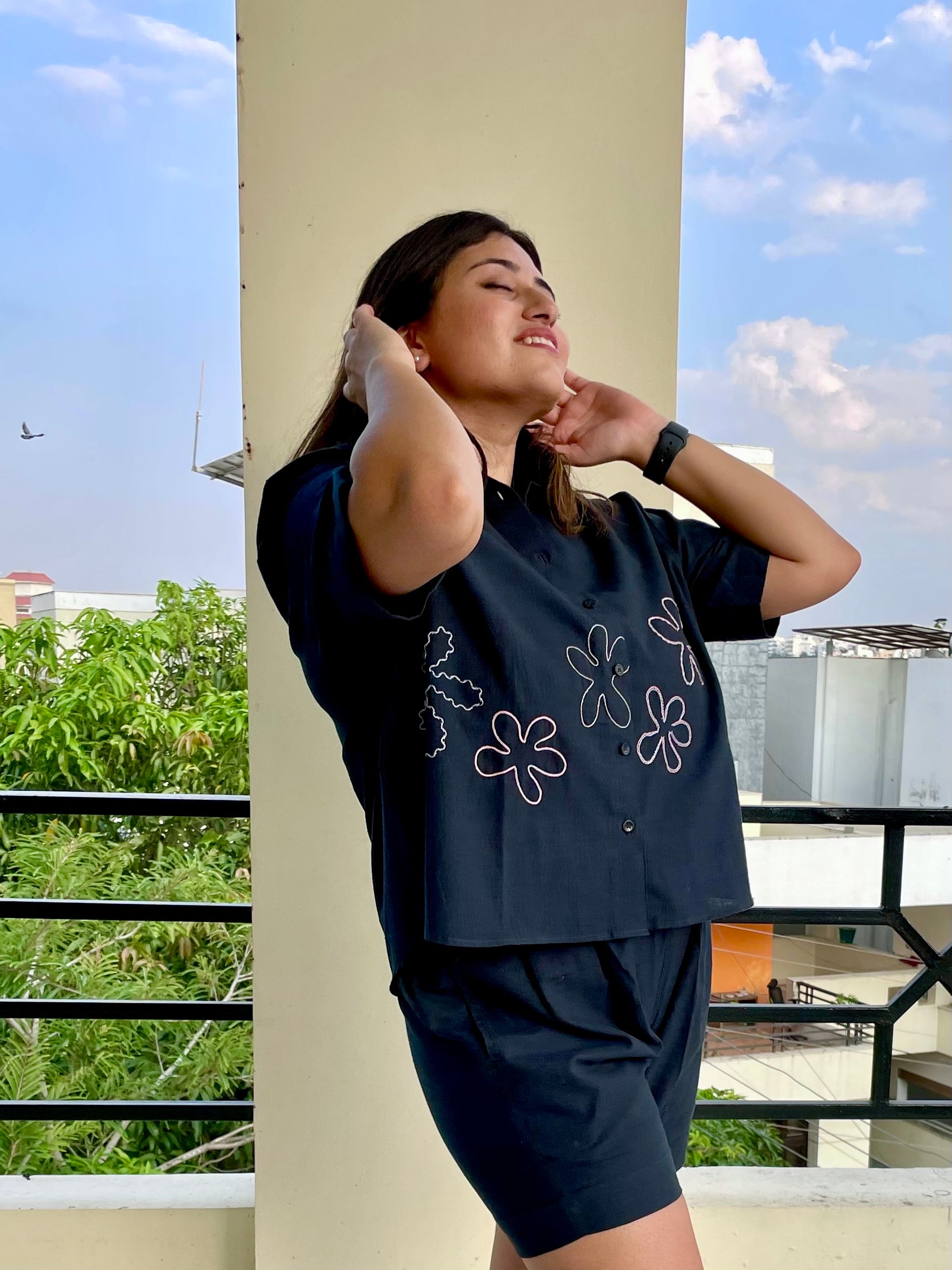 Coordinate your style effortlessly with our Black Cotton Khadi Co-ord Set, designed for elegance and comfort. This stunning two-piece features handloom Khadi cotton in classic black, adorned with intricate white floral hand embroidery that brings artisanal charm. The oversized relaxed-fit shirt pairs perfectly with comfortable shorts, creating an effortlessly chic silhouette. Lightweight and breathable, this set is ideal for vacations, beach days, brunches, or casual outings. Mix and match pieces with your wardrobe for endless styling possibilities. A must-have for timeless elegance and everyday ease!