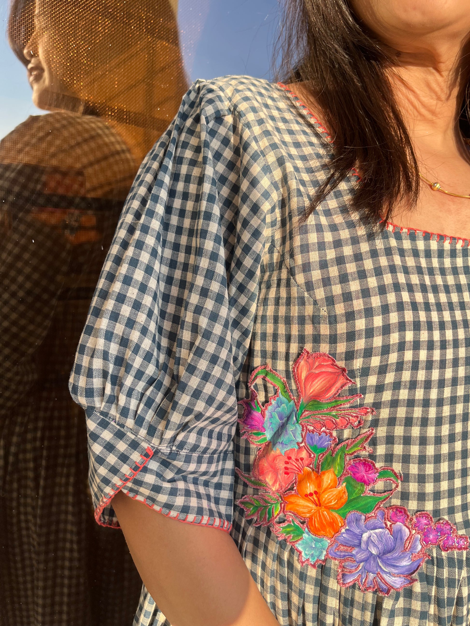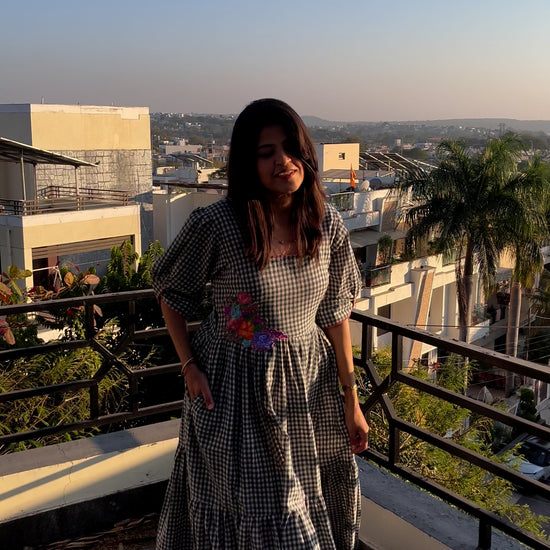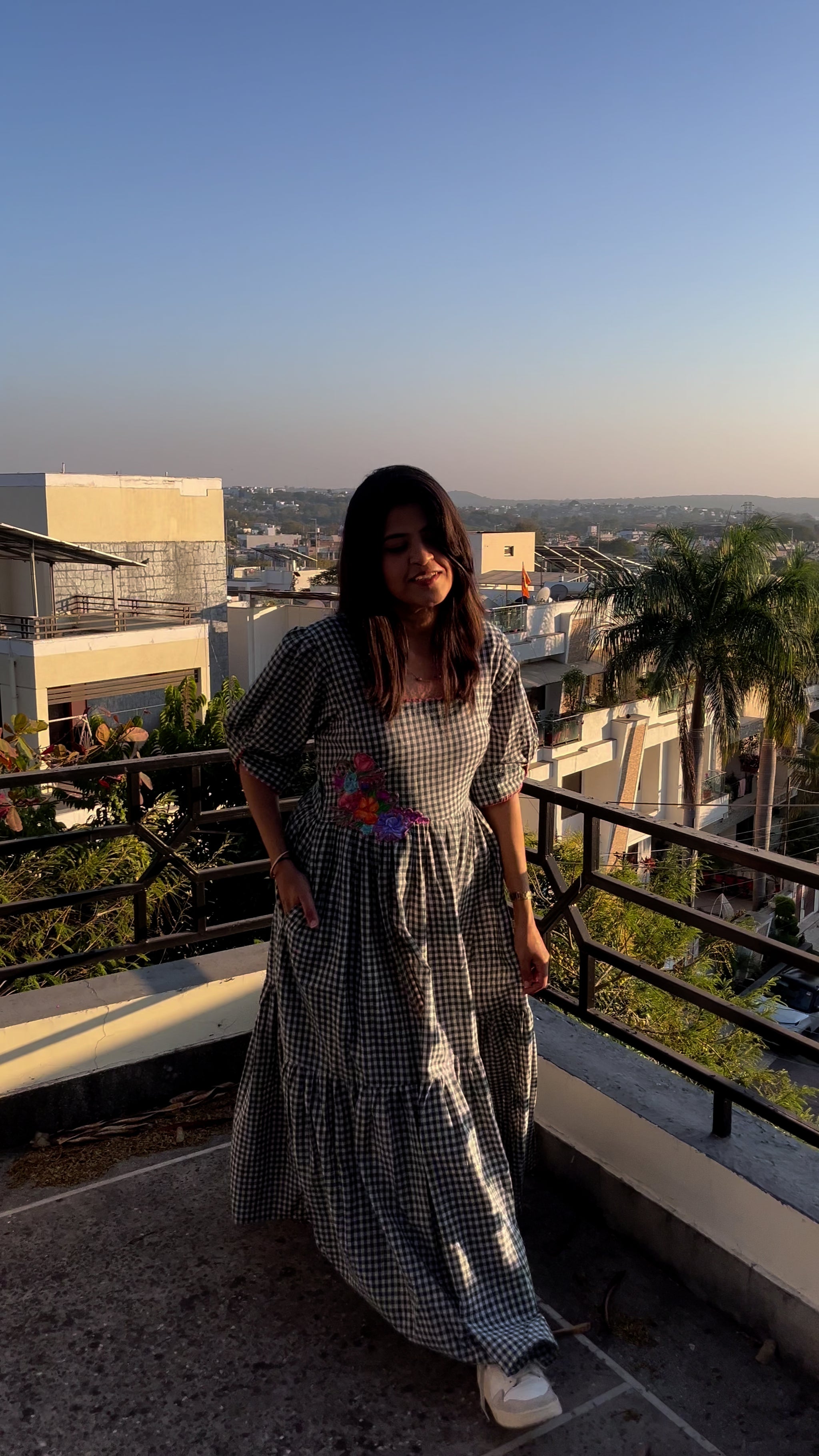 Designed for effortless style and comfort, this Teal Checkered Maxi Dress is crafted from handwoven fabric offering breathable, lightweight wear. The classic checkered pattern in teal and off-white creates a refreshing yet timeless look. Featuring a structured square neckline, half sleeves with subtle thread embroidery, and a hand-painted artistic patch on the yoke, every detail adds unique charm. The tiered design with frilled hems provides beautiful movement and femininity. Perfect for casual outings, brunches, outdoor events, or vacation wear. A versatile maxi dress for various occasions!